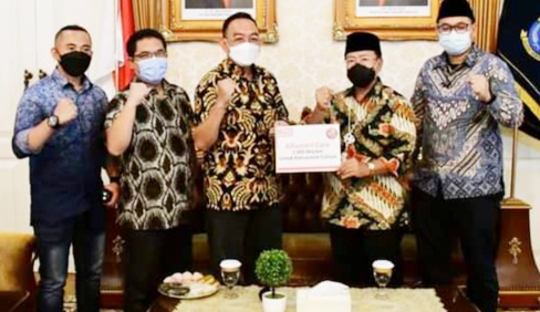 Penyerahan bantuan 5000 Masker diterima langsung oleh Plt Bupati Cianjur H. Herman Suherman di Ruang Garuda Pendopo Cianjur, Rabu (10/3/2021).