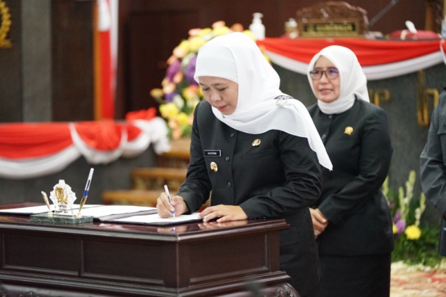 Dimana pengesehan dan pendatanganan APBD Jatim ini dilakukan oleh Gubernur Jatim, Khofifah Indar Parawansa dan Pimpinan DPRD Jatim, Kusnadi, Wakil Ketua DPRD Jatim, Anik Maslachah, Anwar Sadad dan Achmad Iskandar di ruang Paripurna DPRD Jatim, Rabu (15/11/2023).