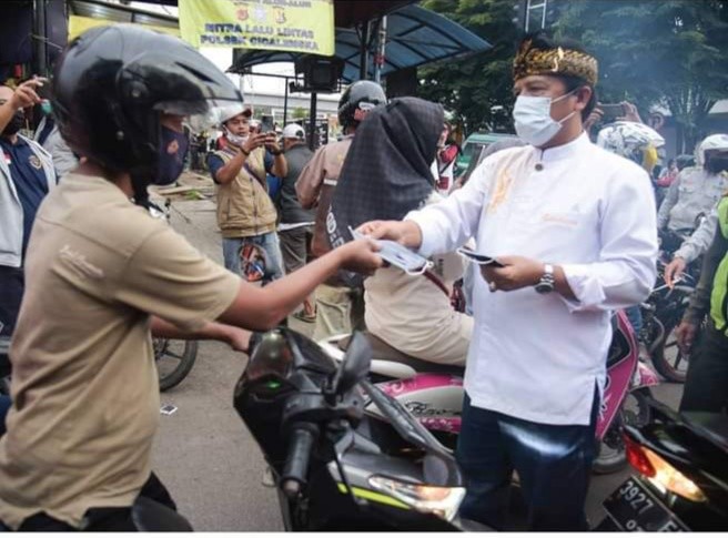 Kab Bandung,transnews.co.id-Bupati Bandung H.Dadang Naser membagi bagikan 3.000 masker kepada para supir angkot dan warga yang melintas di Terminal Cicalengka,Rabu (4/11/2020).
