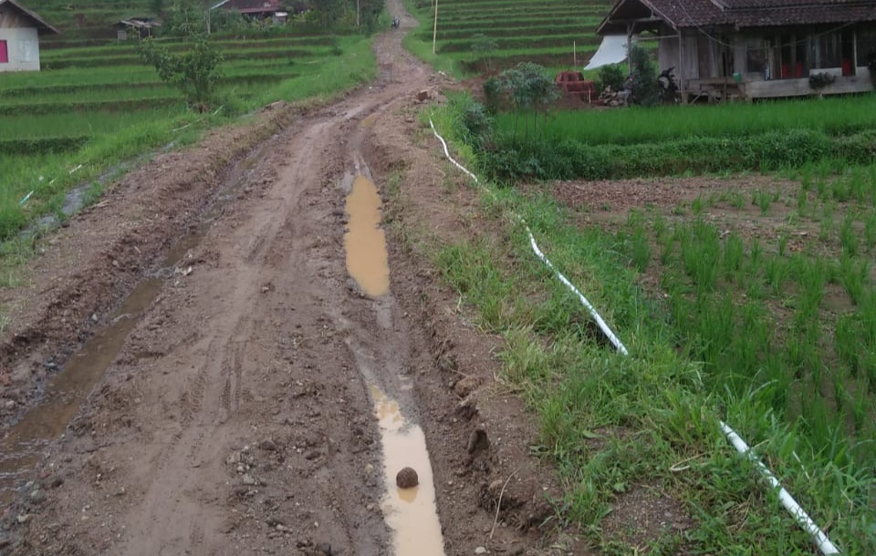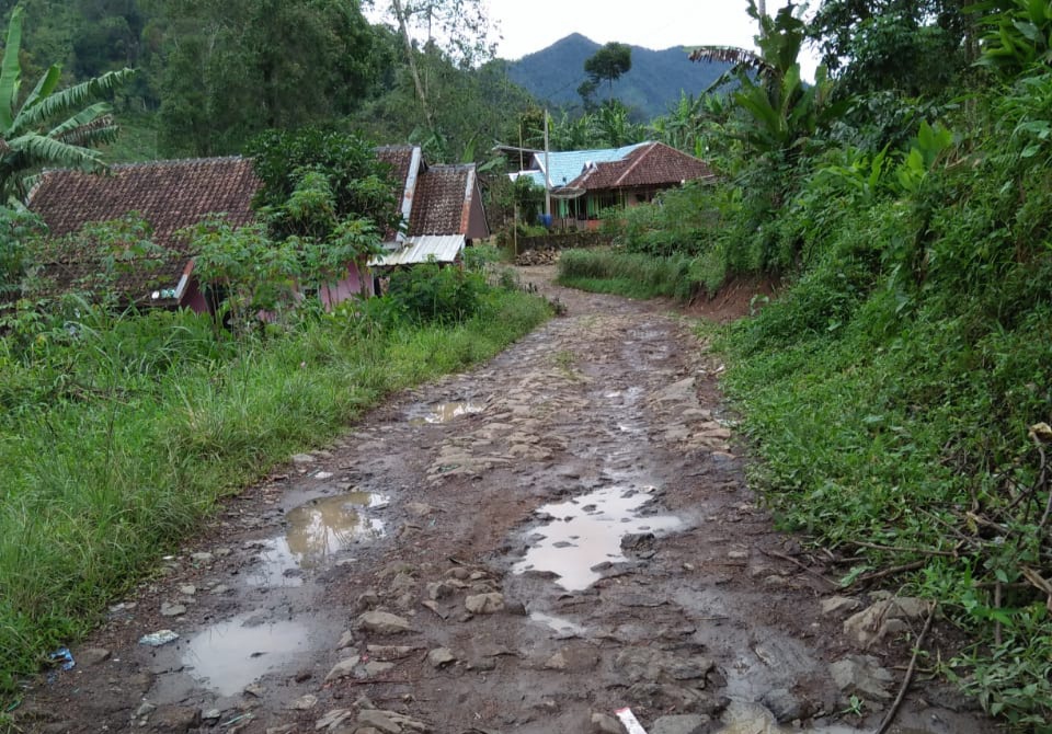 “Jalan tersebut memang sudah pernah ada pengecoran sekira tahun 2008 sepanjang 4.KM,sisanya 8 KM menuju desa yang berbatasan dengan Kab Bandung sangat parah kondisinya,”ujar Kades Rohidin.