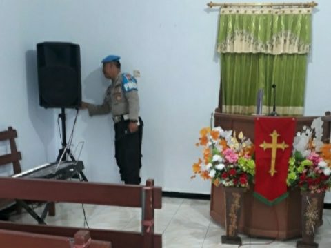 Anggota Polsek Puger mengecek setuasi di dalam gereja sebelum melakukan kegiatan ibadah. (07/04/2023).