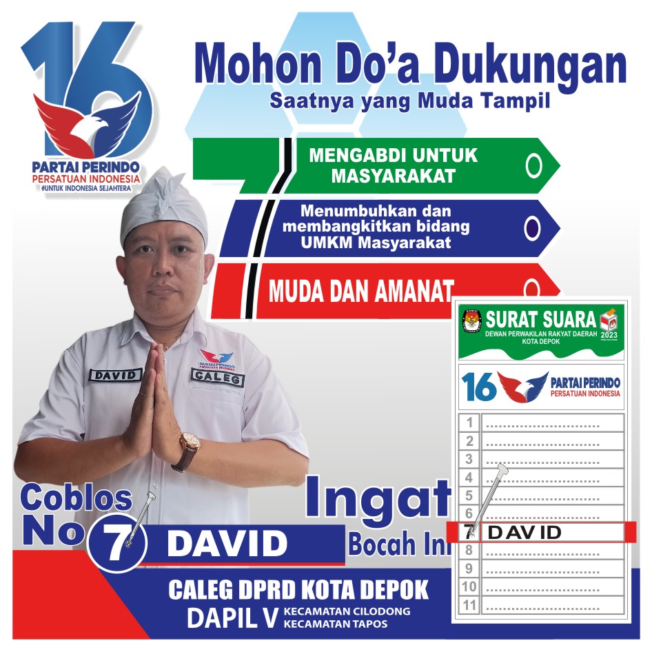 DEPOK, transnews.co.id – David Politikus Muda Partai Perindo hadir dalam meramaikan kontestasi politik untuk Kota Depok. Dia maju dari partai Perindo, Calon legislatif DPRD Kota Depok, dari daerah pemilihan ( Dapil ) V Kecamatan Tapos- Cilodong, No urut 7.