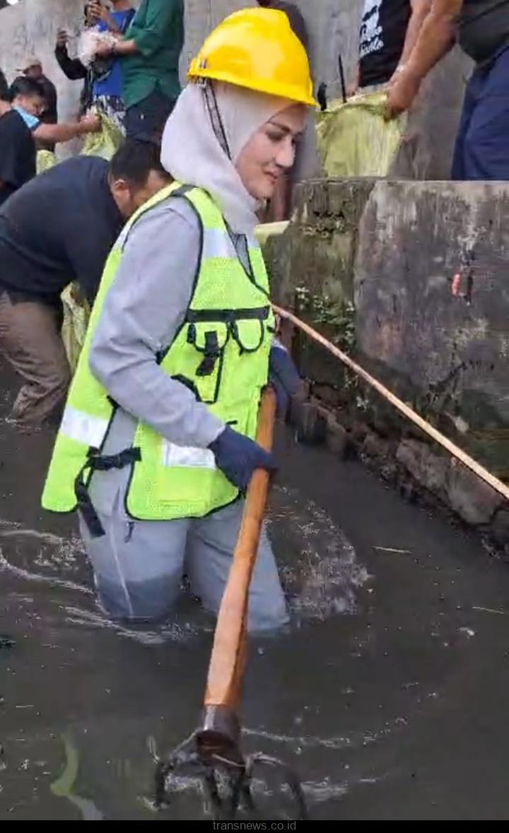 Yeti Wulandari, politisi Gerindra tersebut berjibaku membersihkan kali laya dari sedimentasi yang menjadi titik awal banjir yang melanda taman duta setiap kali hujan turun dengan deras.