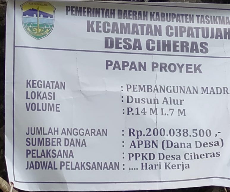 Tasikmalaya,transnews.co.id-Desa Ciheras kecamatan Cipatujah Tasikmalaya telah mengglontorkan anggaran Dana Desa tahap satu untuk membangun dua lokal ruang kelas baru (RKB) MTs Bubujug.