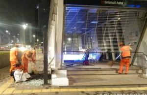 Tampak puluhan Petugas PPSU Kelurahan Karet membersihkan puing-puing pecahan kaca di Stasiun MRT Chase Plaza dan di