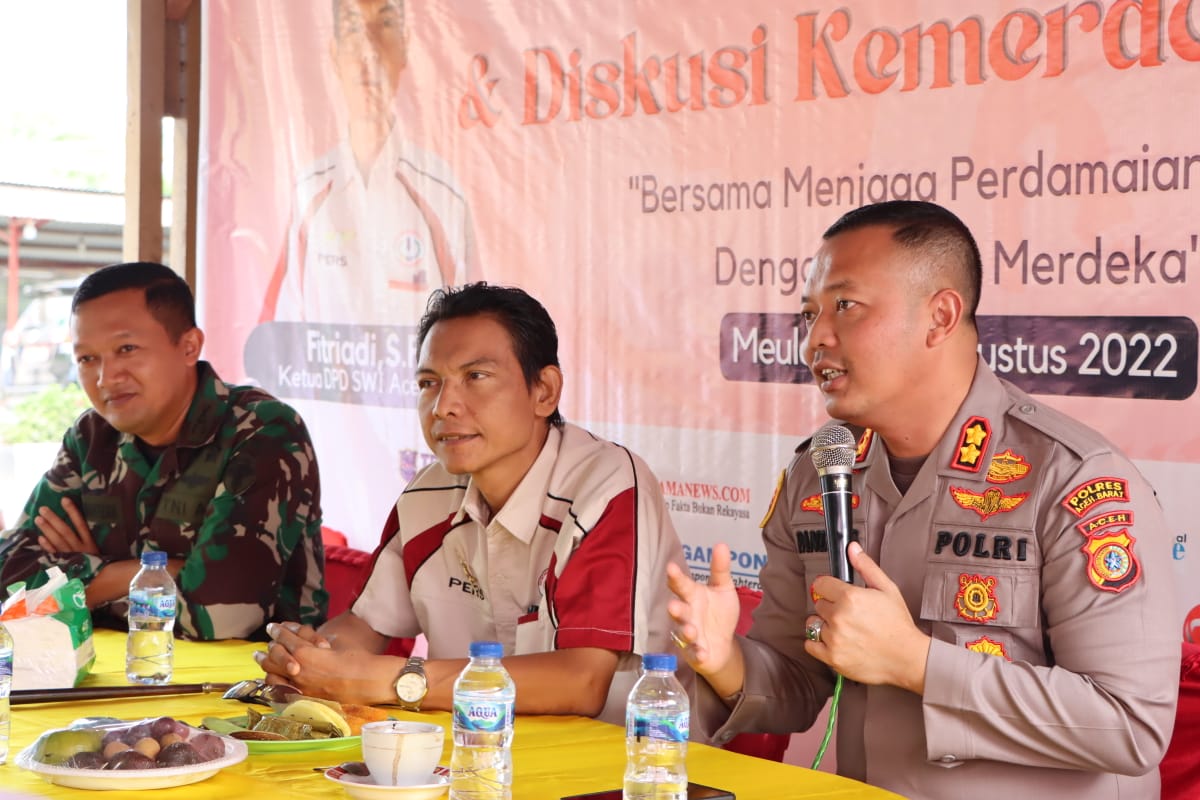 Ditempat yang sama, Kapolres Aceh Barat Pandji Santoso, S.l.K., mengupas 3 komponen yang bisa menciptakan perdamaian yaitu individu, kelompok dan organisasi. Disamping harus bisa memahami bahwa konflik adalah masa lalu, perdamaian masa sekarang dan kemerdekaan sejatinya sebuah tujuan.