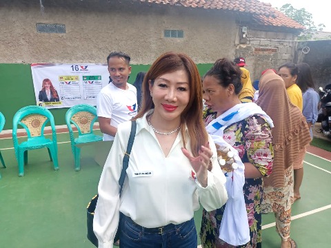 Yenti Nuddin Caleg Partai Perindo DPR RI Dapil Jawa Barat VI (Depok-Bekasi), saat menggelar bazar murah di RW 7 Sukamaju Baru, Tapos, Kota Depok, Selasa (16/1/2024) foto: dokpri