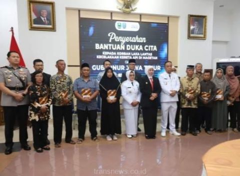 MAGETAN, transnews.co.id – Forkopimda Kabupaten Magetan mendampingi Gubernur Jawa Timur Dra. Hj. Khofifah Indar Parawansa, M.Si, didampingi oleh Forkompinda Kabupaten Magetan penyerahan santunan kepada korban kecelakaan kereta api yang terjadi di perlintasan JPL 08, Kelurahan Mangge, Kecamatan Barat, Kabupaten Magetan di Ruang Jamuan Pendopo Surya Graha, Senin malam (27/5/2025).