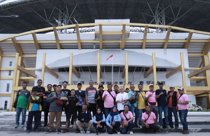 Usai makan para awak media foto bersama di depan stadion JSG sebagai kenang-kenangan.