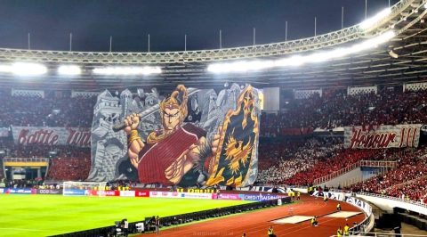 Tifo berjudul “Battle With Honour” ini menampilkan sosok pejuang dengan atribut budaya dari berbagai penjuru Nusantara sebagai bentuk dukungan visual dari para suporter untuk Timnas.