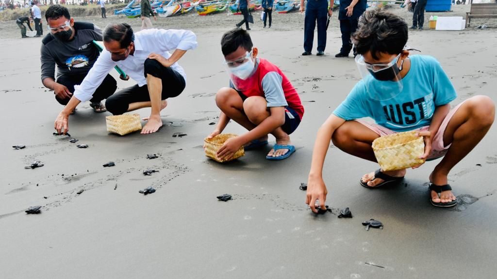 Cilacap, Transnews.co.id – Presiden Joko Widodo mengakhiri rangkaian kunjungan kerja di Kabupaten Cilacap, dengan melakukan kegiatan pelepasliaran tukik di Pantai Kemiren, Kecamatan Cilacap Selatan, pada Kamis, 23 September 2021. Melalui kegiatan tersebut, Presiden berharap kelestarian satwa penyu di Tanah Air dapat terus terjaga.