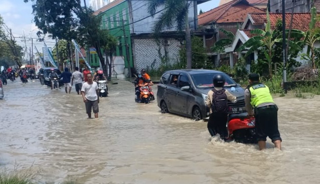 Karena macet,anggota Polsek Benjeng bersama dengan jajaran Koramil Benjeng melakukan pengaturan lalu lintas dan pemantauan di area ruas jalan raya yang terendam banjir itu.