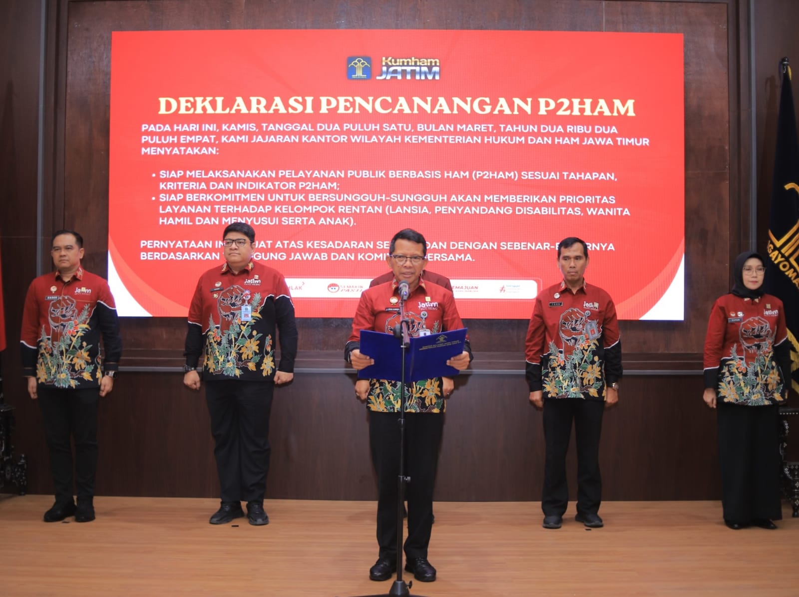 SURABAYA, transnews.co.id – Kantor Wilayah Kementerian Hukum dan HAM Jawa Timur terus mendorong terciptanya Pelayanan Publik Berbasis HAM (P2HAM). Tidak hanya satuan kerja, jajaran Kemenkumham Jatim tahun ini juga mengajak pemerintah daerah baik pemprov maupun Pemkab dan Pemkot untuk menciptakan P2HAM.