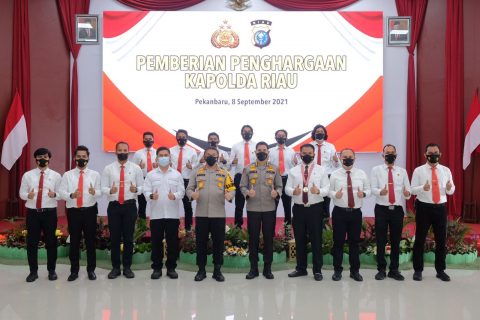 Penghargaan diberikan oleh Kapolda Riau Irjen Agung Setia Imam Effendi pada acara yang digelar di aula Tribrata Polda Riau Rabu 8/9/2021.