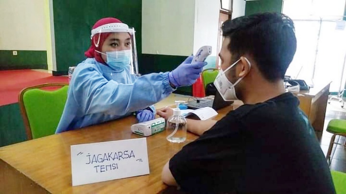 Pelaksanaan vaksinasi kepada tenaga kesehatan di Poltekkes 1 Kementerian Kesehatan, Pondok Labu Cilandak, Jakarta Selatan.