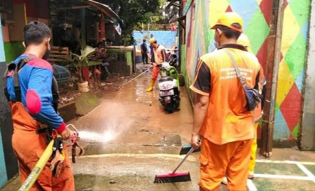 Jakarta,transnews.co.id-Petugas Damkar Sektor 5 Pos Lebak Bulus, dan PPSU Kelurahan Pondok Labu membersihan lumpur pasca banjir di Jalan Musyawarah, RT 011, RW 003, Pondok Labu, Cilandak, Jakarta Selatan, Minggu (21/2/2021).