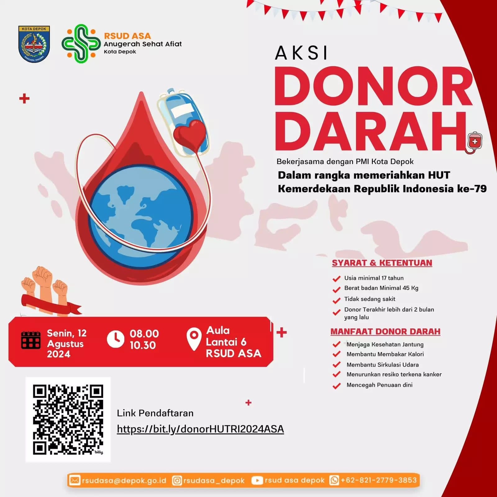 DEPOK, transnews.co.id – Dalam rangka ikut memeriahkan Hari Ulang Tahun (HUT) ke-79 Kemerdekaan Republik Indonesia (RI), Rumah Sakit Umum Daerah (RSUD) Anugerah Sehat Afiat (ASA) bekerja sama dengan PMI Kota Depok akan menggelar kegiatan donor darah.