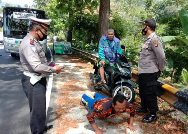 Kab Tasikmalaya,transnews.co.id- Polsek Kadipaten Tasikmalaya memberi sanksi teguran kepada 10 orang, sanksi sosial membersihkan jalan 23, sanksi fisik push-up 20.