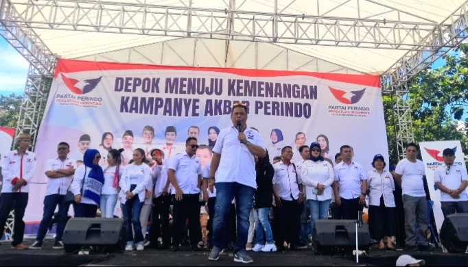 Acara diisi orasi para Caleg Perindo diselingi nyanyian untuk menghibur rakyat Depok.
