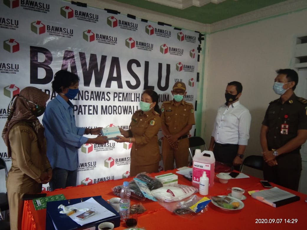 Morut, transnews.co.id-Kepala Dinas Kesehatan Delnan Lauende, M.Kes. secara simbolik serahkan bantuan hibah APD kepada Bawaslu Morowali Utara Sulawesi Tengah,Senin (7/9/2020)