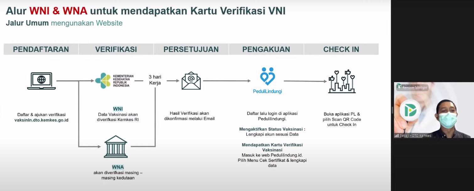 “Jadi kami sudah menyiapkan website dengan alamat vaksinln.dto.kemkes.go.id untuk para WNI maupun WNA untuk mendaftarkan dan kemudian nanti akan kita verifikasi,” ujarnya. Adapun prodesur untuk memperoleh Kartu Verifikasi VNI tersebut adalah sebagai berikut: