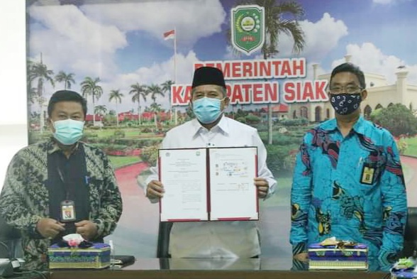 Penandatanganan Kerjasama tersebut dilaksanakan secara virtual di masing-masing Daerah. Untuk di kabupaten Siak, dilaksanakan di Ruang Rapat Pucuk Rebung, Kantor Bupati Siak, Rabu (21/4/2021).