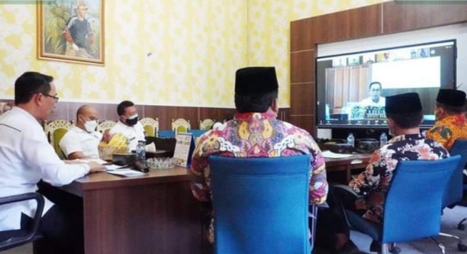 menggelar Rapat Koordinasi secara virtual dengan Kementerian Agama RI di Ruang Rapat Segitiga Rumah Dinas Bupati, Rabu (28/7/2021).