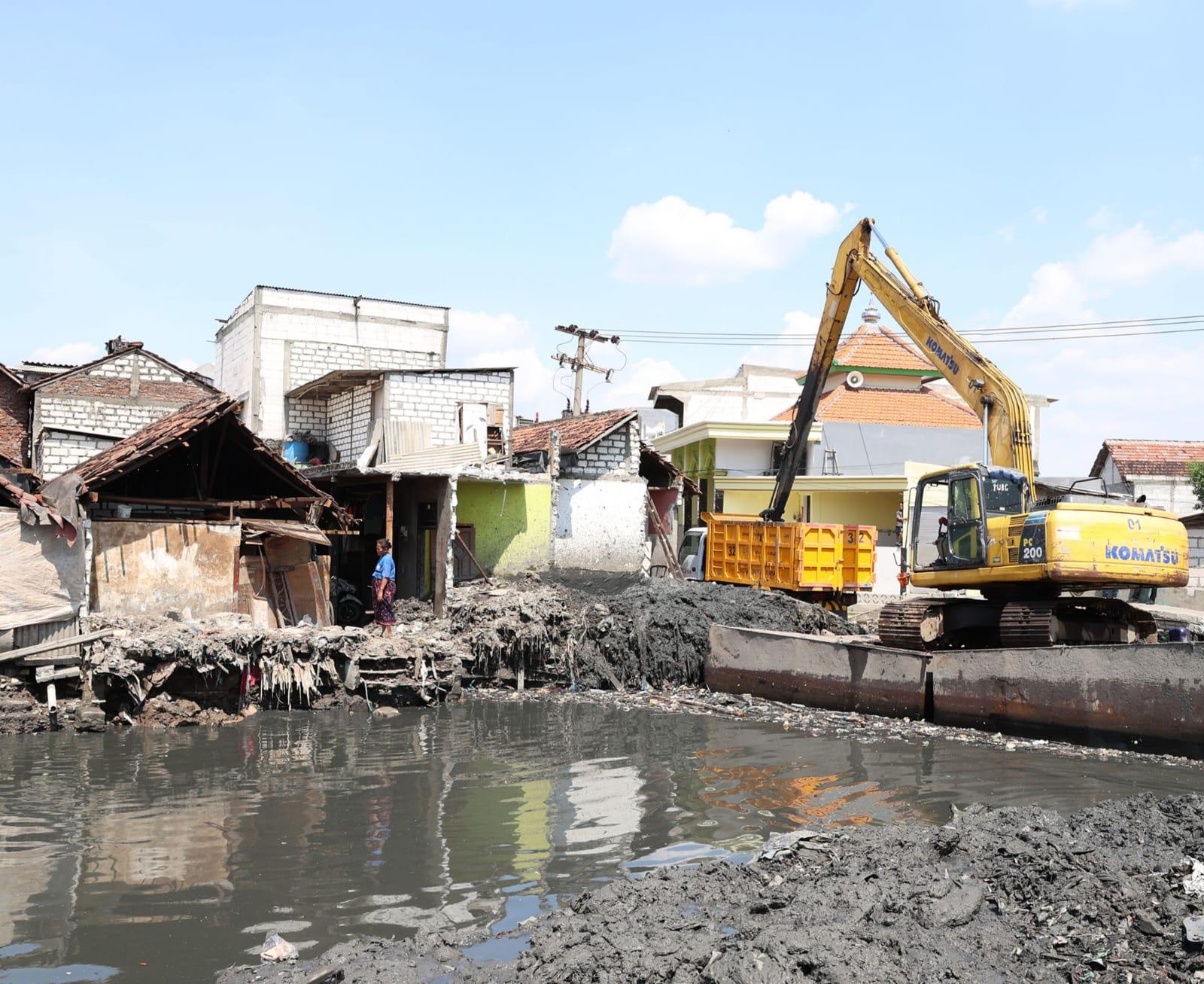 Penertiban tahap pertama, yang mencakup sepanjang 700 meter sungai, saat ini memasuki tahap finishing pengerukan dan merapikan sisa-sisa bangunan.