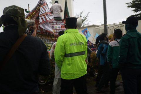 Personel pengamanan melihat massa aksi unjuk rasa sudah tidak sesuai dengan Protokol Kesehatan, maka kami menghimbau agar mereka menggunakan masker dan tertib Prokes.