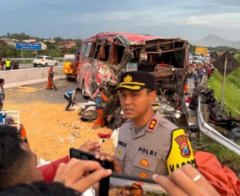 Kecelakaan tersebut melibatkan satu unit bus dan truk pengangkut pakan ternak di ruas Tol Pandaan – Malang.
