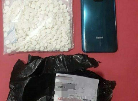 Barang bukti obat keras berbahaya jenis Trek logo Y sebanyak 1000 butir dan satu unit handpone redmi note 9 warna hijau
