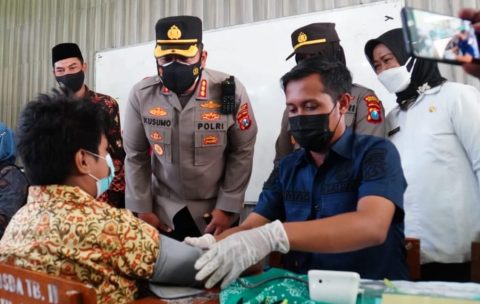 Kapolresta Sidoarjo Kombes Pol. Kusumo Wahyu Bintoro, Rabu (12/1/2022) pagi, mengecek pelaksanaan vaksinasi Covid-19 dosis kedua bagi anak usia 6 sampai 11 tahun di Madrasah Ibtidaiyah (MI) Negeri 2, Sedati, Sidoarjo.