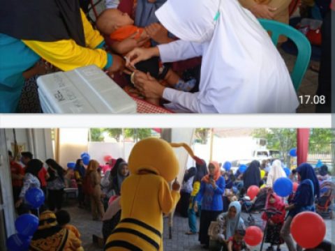 Ikon boneka Albi dari Alfamart dan Ibu ibu posyandu dengan sabar melayani warga yang hadir untuk memerisakan bayinya secara gratis