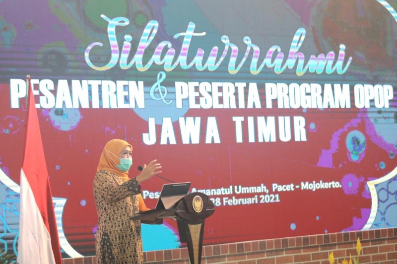Hal ini dikatakan Gubernur Jawa Timur, Khofifah Indar Parawansa, saat kegiatan silaturrahmi pesantren dan peserta program OPOP Jawa Timur di aula Pondok Pesantren Amanatul Ummah, Pacet, Mojokerto, Minggu (28/2/2021).