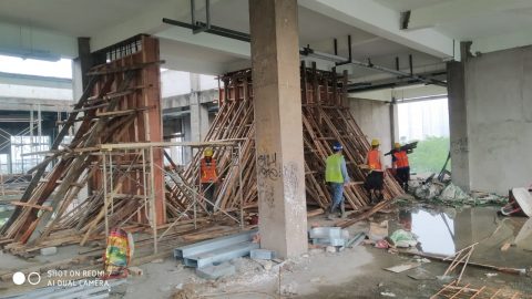 Para pekerja PT Diatasa Jaya Mandiri sedang membongkar dan membersihkan bekas begisting yang ada di lantai 2 .