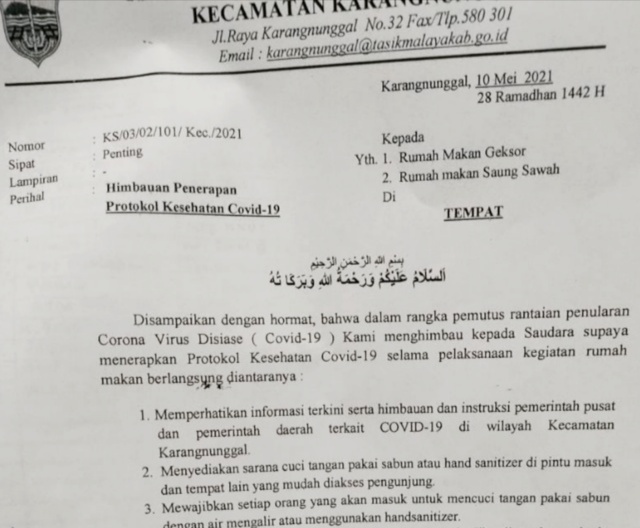 Himbauan dilayangkan kepada pengelola RM Geksor dan RM SaungSawah tersebut, berupa surat himbauan yang ditandatangani Kapolsek, Danramil dan Camat Karangnunggal selaku tim Gugus Tugas Covid -19 tingkat Kecamatan.