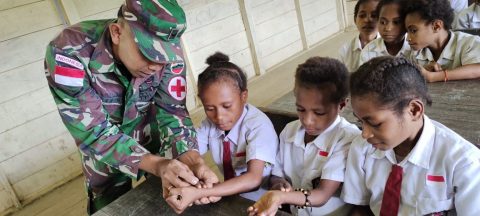 Keerom, Transnews.co.id – Satgas Pamtas RI-PNG Yonif 126/KC Pos Somografi memberikan pembekalan ilmu kesehatan kepada siswa SD YPPK Akarinda Kampung Somografi, Distrik Web, Kabupaten Keerom.
