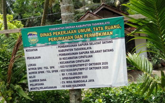 Informasi yang berhasil dihimpun dilapangan menyebutkan, gapura tersebut dikerjakan oleh CV.Wira Manggala Jaya dengan menelan anggaran 1.150 juta bersumber dari APBD Banprov Dinas PUPR Kabupaten Tasikmalaya tahun 2020.