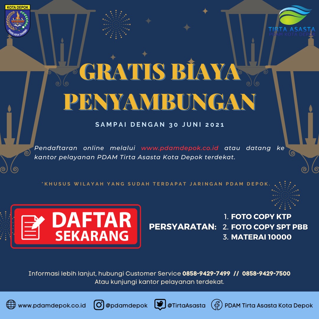 Masyarakat Kota Depok kini semakin mudah dalam memperoleh akses air bersih melalui promo ini. Selain promo yang menarik, PDAM juga memberikan akses pendaftaran yang semakin mudah. Kini, pendaftaran dapat dilakukan melalui registrasi online di www.pdamdepok.co.id atau datang langsung ke kantor pelayanan terdekat dengan membawa persyaratan yang sebagai berikut: