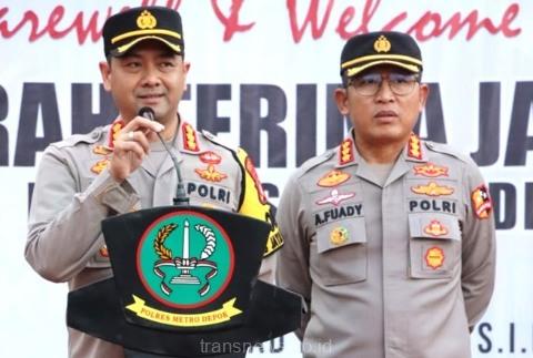 Kapolres Metro Depok Kombes Arya Perdana memberikan sambutan dan pesan untuk jabatan barunya dan tanggung jawab yang baru di satuan kerjanya menjadi pemimpin yang bijaksana dan bertanggung jawab.