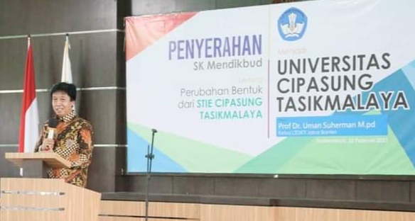 Tasikmalaya,transnews.co.id- Sekolah Tinggi Ilmu Ekonomi (STIE) Cipasung Tasikmalaya Jawa Barat kini resmi berubah status menjadi Universitas Cipasung Tasikmalaya. Perubahan nama tersebut ditetapkan dengan SK Kemendikbud.