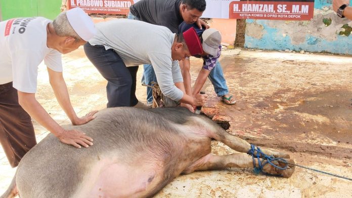 Depok, transnews.co.id – Politisi Gerindra Kota Depok, H. Hamzah menyembelih seekor kerbau dalam momen peringatan Maulid Nabi Muhammad SAW yang dirangkai dengan tasyakuran atas terpilihnya Supian Suri – Chandra Rahmansyah sebagai kepala daerah pada pilkada 27 November lalu.