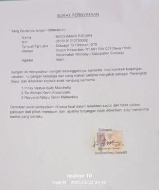 “Muhammad Riduan dengan alamat Dusun Kesamben RT 02/ RW 01 Desa Ploso kecamatan Wonoayu telah menyatakan dengan sesungguhnya bersedia memberikan tunjangan jabatan,”