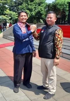 Ketua DPD NasDem Kota Depok Hardiono berjabat tangan dengan Komisioner KPU Provinsi Jawa Barat, Abdullah Syafi’i usai acara serah terima Kirab Pemilu 2024 di Alun-Alun kota Depok, Minggu (19/11/2024).
