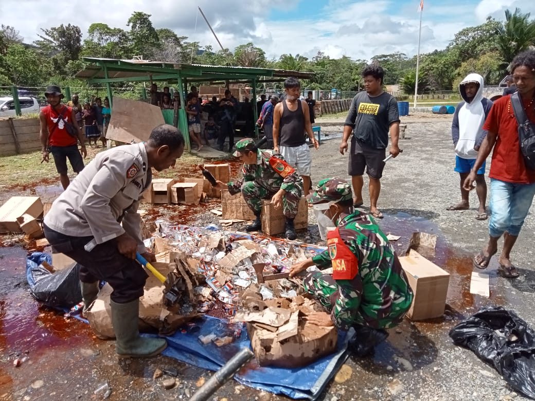 TNI – Polri beserta Masyarakat Musnahkan 2760 Botol Miras di Jalan Trans Jayapura-Wamena