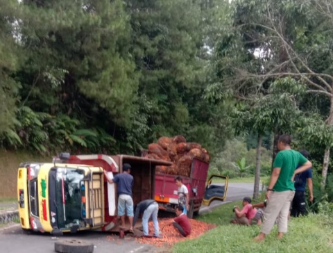 Garut, TransNews.co.id-Truk jenis colt disel No Pol F.8445 VD pengangkut sawit terbalik di jalur jalan Kp Gunung Gelap Desa Mekarwangi Cihurip kabupaten Garut.