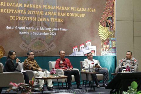 Sementara sebagai narasumber utama, Dansat Brimob Polda Jawa Timur Kombes Pol Suryo Sudarmadi, menyampaikan strategi Polri dalam pengamanan Pilkada 2024 Jatim yang menekankan pentingnya deteksi dini, penguatan hukum, dan pengelolaan potensi kerawanan di tiap tahap Pilkada.