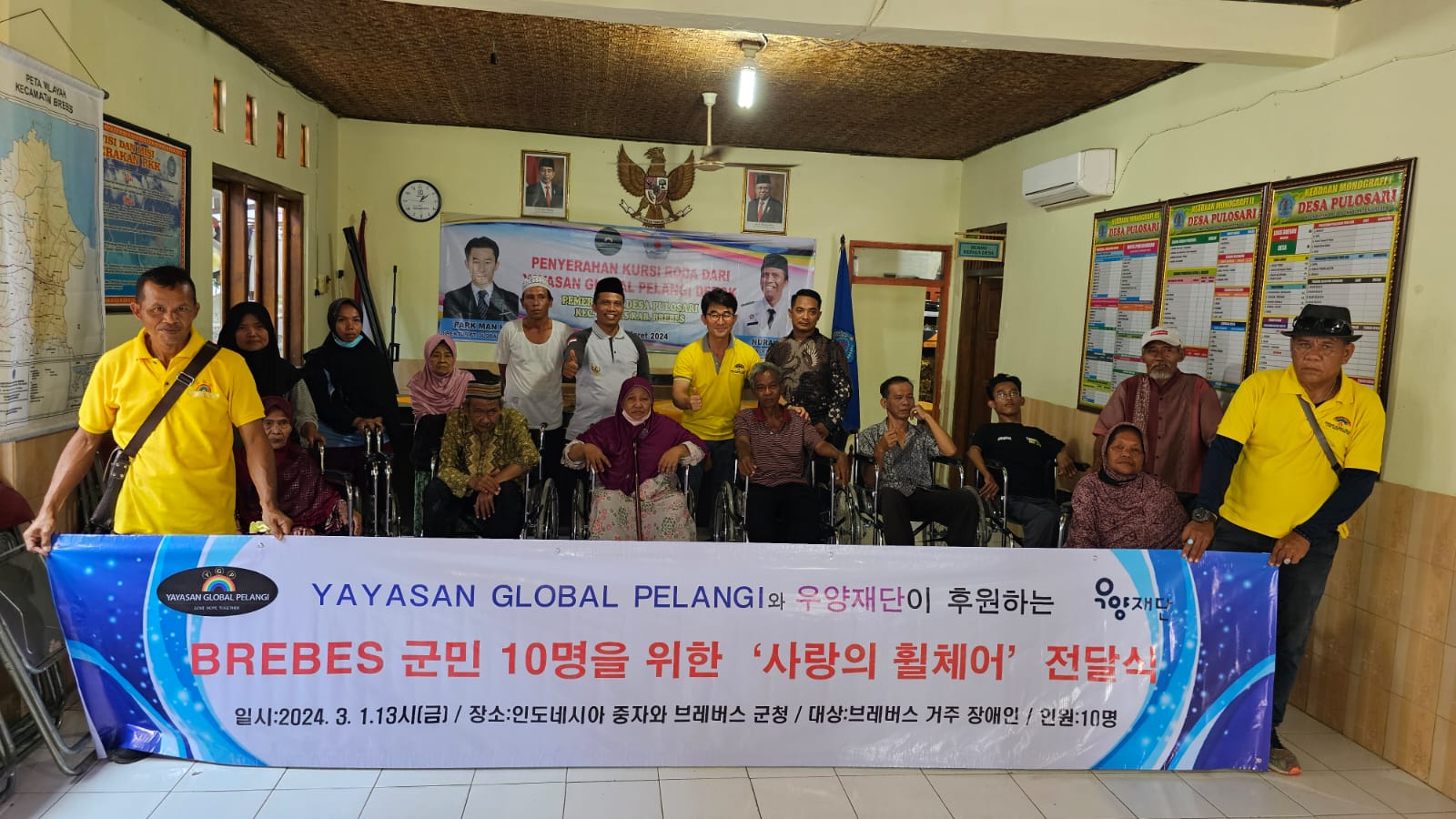 Penyerahan bantuan kursi roda dari yayasan global pelangi ini dilakukan di aula balai desa Pulosari Kecamatan Brebes Kabupaten Brebes Provinsi Jawa Tengah, Jumat (01/03/2024).